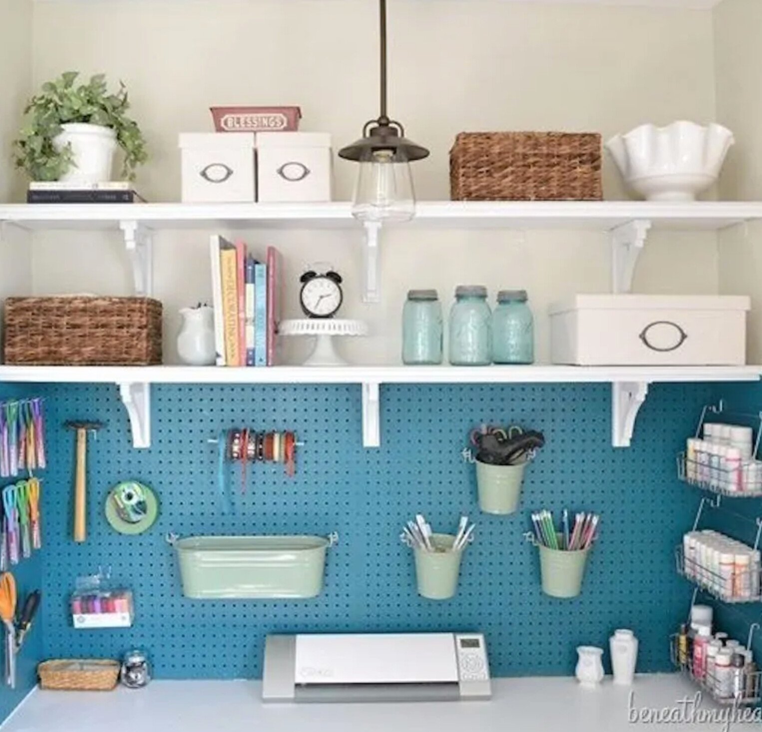This keeps your desk surface clear while making your craft room office feel creative and efficient. You can even paint the pegboard to match your color scheme for a cohesive look.