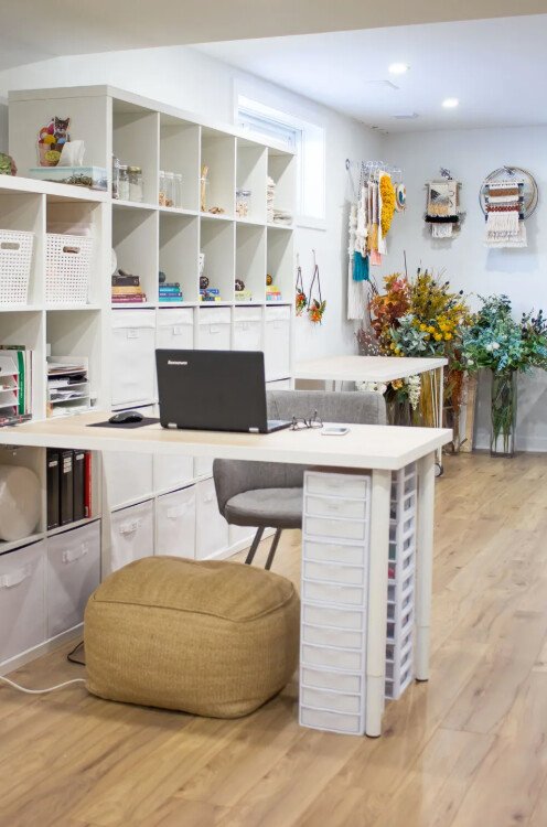 You don’t need a huge room to create a functional craft office. A slim desk paired with vertical storage can transform even a small corner into a productive workspace.