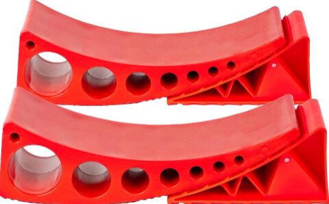 Instead of stacking, you simply drive onto a curved ramp until your bubble level centers—then chock it in place.
